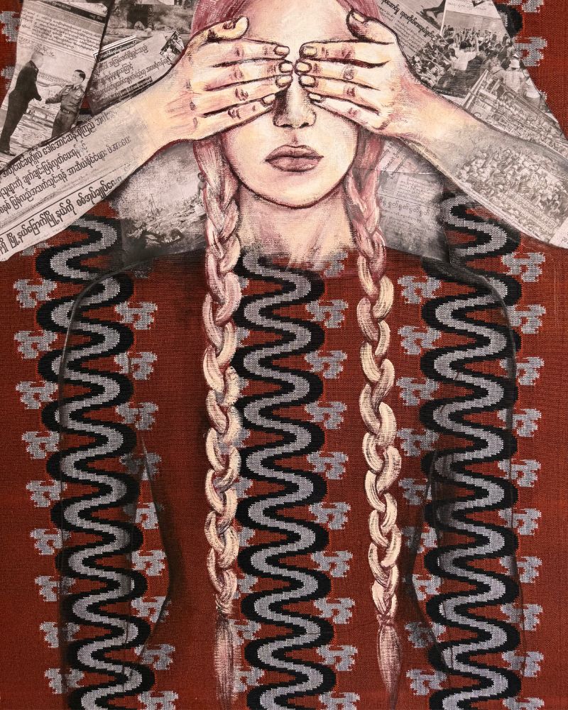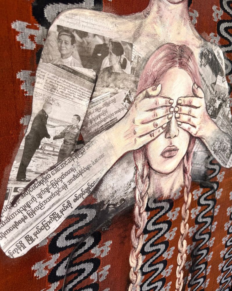 Acrylic paint is applied directly onto the prepared fabric surface, allowing the material to remain visible and active. Two female figures are constructed through a combination of painted form and collage. Newspaper clippings drawn from Myanmar’s political context are cut, layered, and assembled to form the second figure, then integrated into the painted surface. The coexistence of paint and printed text creates tension between embodied presence and imposed narrative.